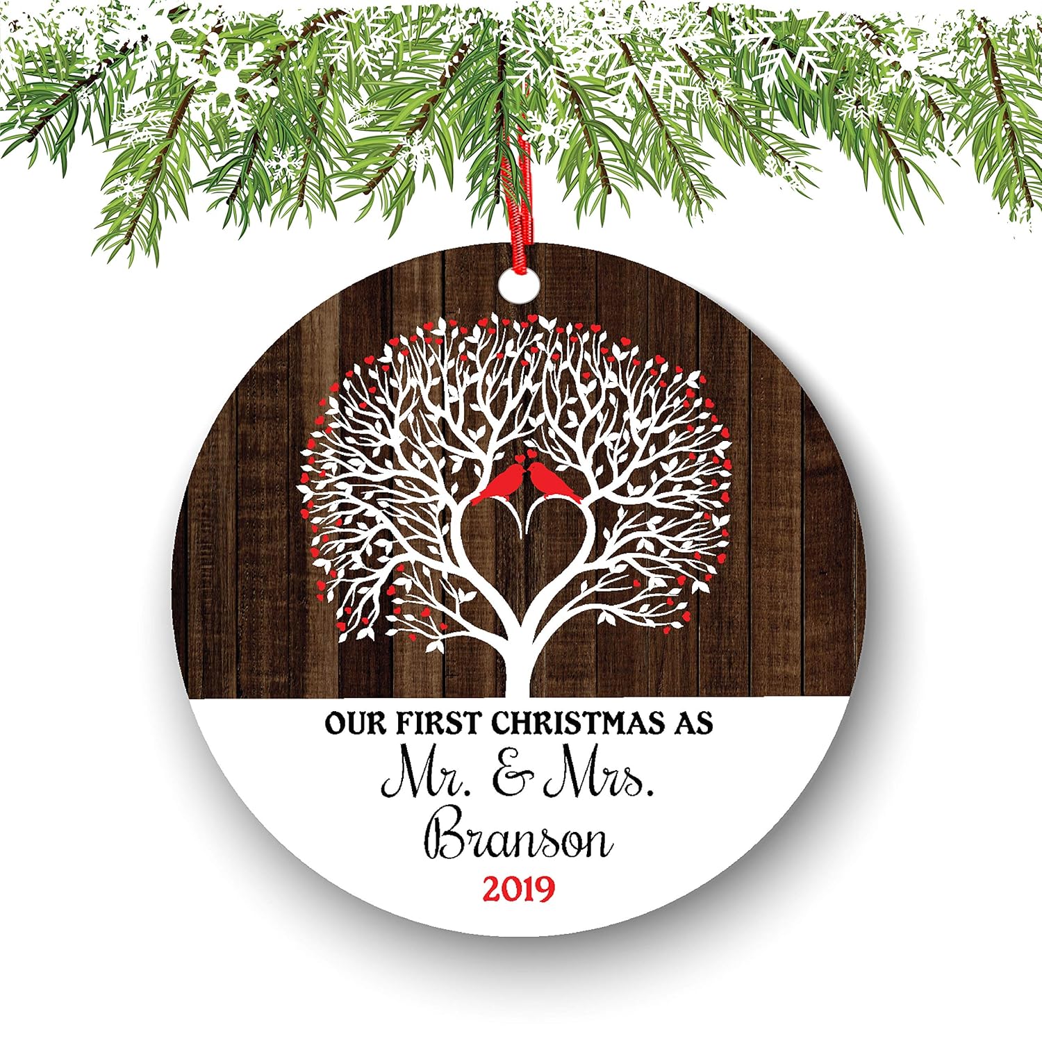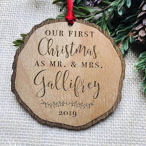 Amazon Com Personalized First Christmas As Mr Mrs Ornament Last Name Rustic 1st Married Christmas Ornament First Married Laser Engraved Wooden Ornament With Red Ribbon And Gift Box Handmade